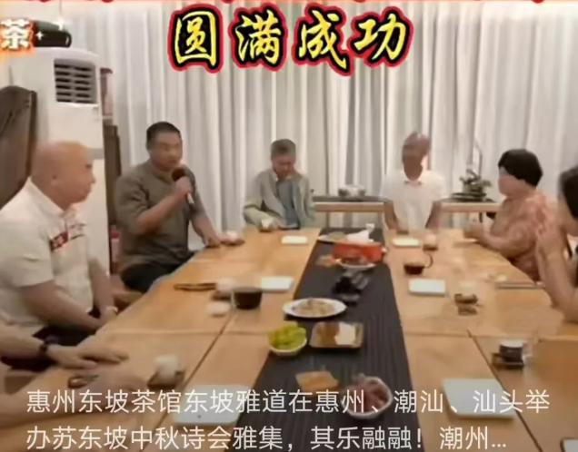 惠州东坡茶馆东坡雅道总策划黄圣发先生发来视频,祝贺杭州苏东坡中秋诗会雅集圆满成功,发动组织惠州、潮汕、汕头共庆苏东坡中秋诗会雅集,潮州潮府工夫茶博物馆方云帆馆长朗诵东坡诗词,东方凤凰琴茶院院长黄圣发古筝伴奏,汕头自乐斋主蔡为盛社长作画。其乐融融!