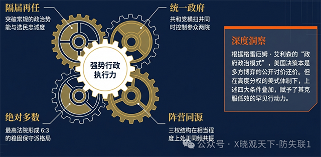 同时,他还分析了川普在第二任期所拥有的一系列政冶条件: