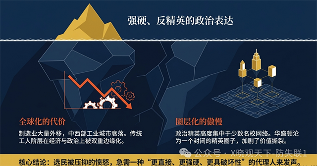 在过去几十年里,美国制造业大量外移,中西部许多工业城市逐渐衰落。一大批传统工人阶层在经济和政冶上都感到被边缘化。