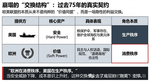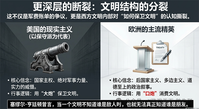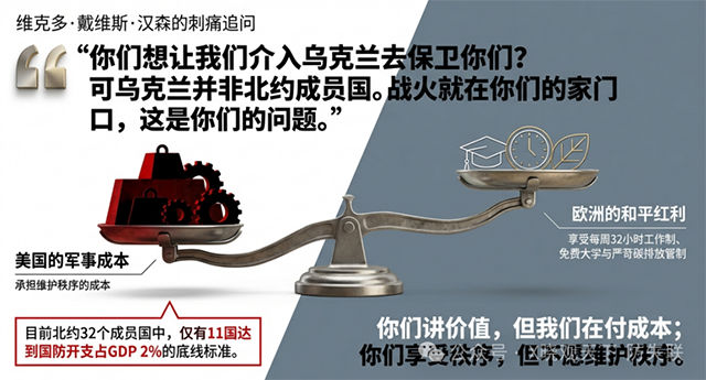 过去75年里,美guo与欧洲之间形成的默契其实非常简单——美guo提供安全保障,欧洲负责道德说教。欧洲将“和平红利”挥霍在每周32小时工作制、免费大学教育,以及一套导致自身经济“去工业化”的严苛碳排放管制上。与此同时,在北约全部32个成员国中,目前仅有11个guo家达到了此前承诺的国防开支占GDP 2%的标准。