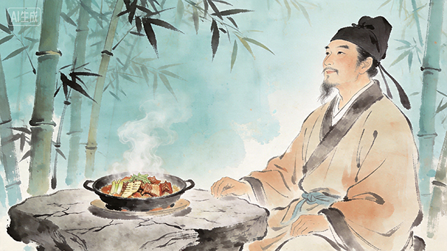宋人苏东坡的《竹笋焖肉》——“无竹令人俗,无肉使人瘦。不俗又不瘦,竹笋焖猪肉。”——则是栩栩如生的“吃货”活形。无奈该诗在苏轼正式文集中也未收录,坊间亦曰作于杭州或黄州不等。后来“好事者”考证出“间接证据”曰:南宋周紫芝《竹坡诗话》提及苏轼的“竹笋焖肉”。清代袁枚《随园食单》在“笋煨火肉”条目中,记载了苏轼以火腿炖笋。而《苏轼诗集》卷十一里《初到黄州》亦有“好竹连山觉笋香”的句子——凑在一起,也算“打油”有据了。