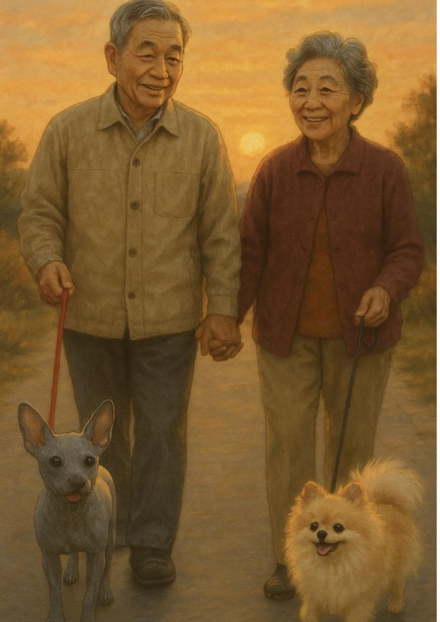 老太太牵的那只博美实在太粘人了。带它散步,它却两步一回头,三步一驻足,时常抬头眼巴巴地望着女主人。是它太懒,不想走吗?只见老太太满脸怜爱地把它抱起来,走几步又放下来。它没走几步又犯了“老毛病”。唉,到底是人遛狗,还是狗遛人呢?黄昏时分,老夫妇牵着两只毛孩子散步的画面,成了我们这个街区一道温馨而美好的风景线。