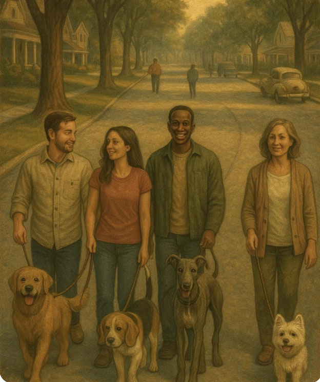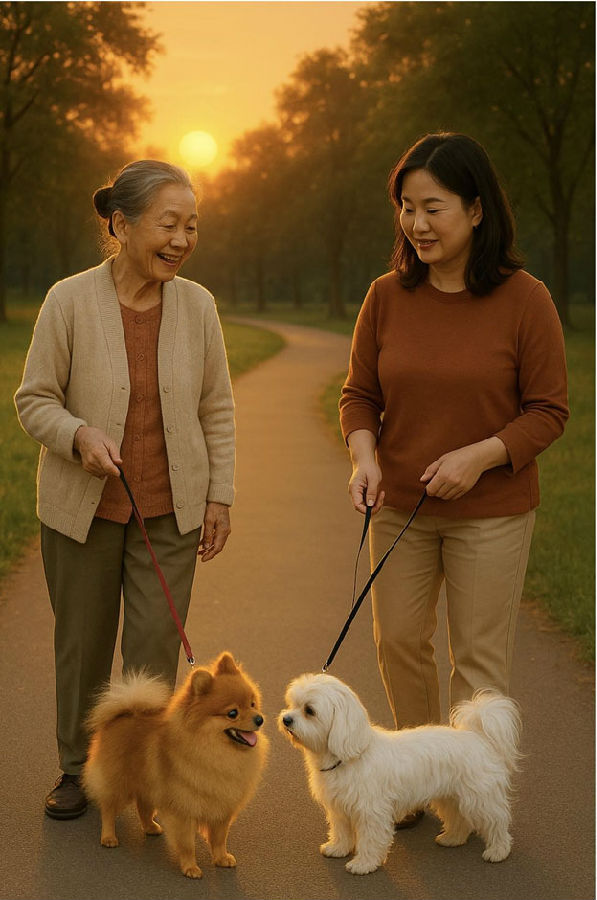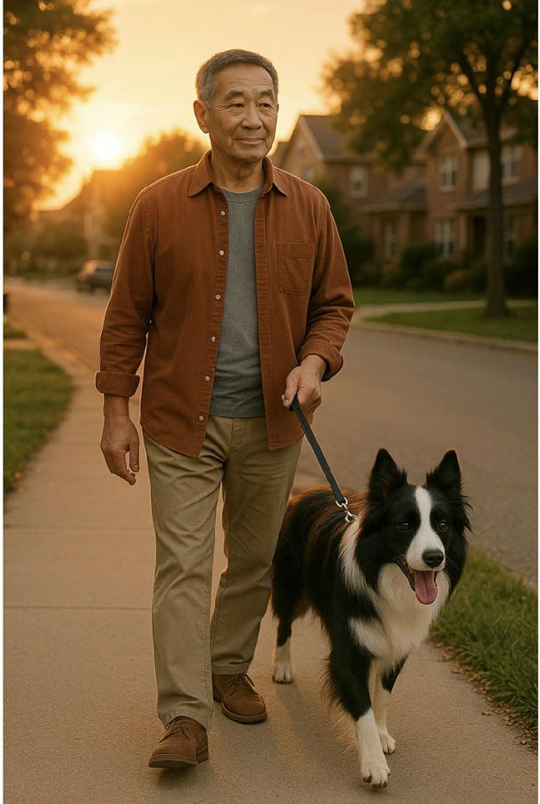 每当我们和他(她)们相遇,都会礼貌性地打个招呼,道一声“Hi!你好!”有一次聊得多了几句,才知道那只博美犬居然还是一只 Service Dog(服务犬)呢!脖子上挂着带编号的金属牌,别看她个子小,却是受过正规训练、有注册身份的服务犬,而且出身富贵名牌,并不是流浪狗来着。据老先生说,因为太太患有Anxiety(焦虑症),医生开了证明,这只狗就是太太的情感支柱(Emotional Support Animal)。他们出远门旅行也会带上她。有些地方如餐厅、酒店,虽然贴着“Pets Not Allowed”(禁止宠物入内)的标志,但这只狗却能大摇大摆地进入,因为她是服务犬,有合法文件和狗牌。我这才第一次知道,原来不只是导盲犬才算服务犬,真是太人性化了。难怪她在散步时总是时刻关注着自己的主人——因为她“公务在身”,得尽职尽责。
