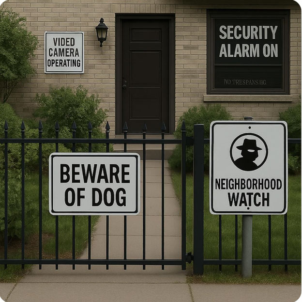 自从新冠疫情以来,企业倒闭、裁员不断,失业率上升,社会风气变坏。商店、超市小偷小摸、入室盗窃、砸车窗、街头抢劫、枪击事件频发。怎么办呢?看来,光靠一只狗和“Beware of Dog”(小心恶犬)这类标示,已无法让人安心。还得加装警铃(Security Alarm)、监控摄像头(Video Camera),并加强邻里互助(Neighborhood Watch),才比较放心啊。