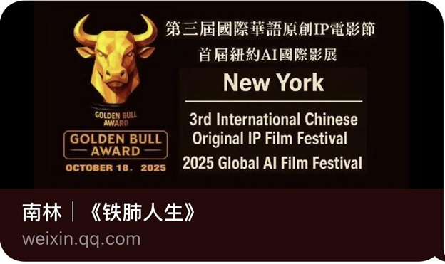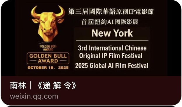 第三届国际华语原创IP电影节暨首届纽约AI国际影展(3rd InternationalChinese Original IP Film Festival & 2025 Global AI Film Festival - New York)将于2025年10月15日至18日,在纽约电影学院、曼哈顿会所、法拉盛图书馆及百老汇剧院隆重举行。