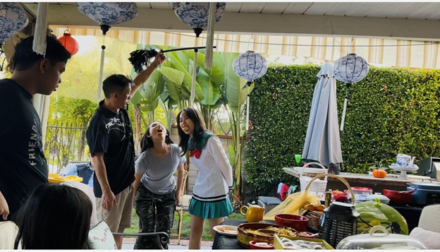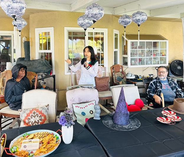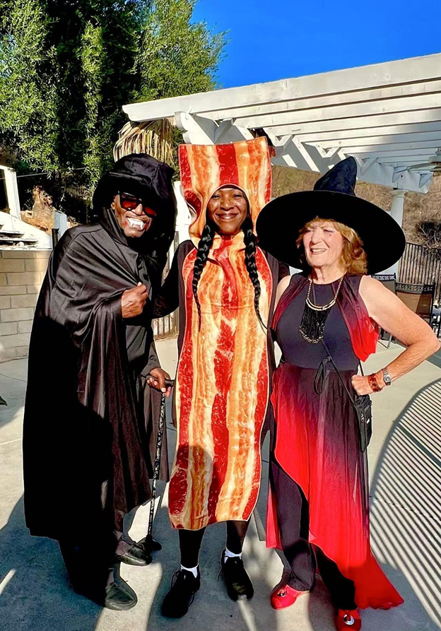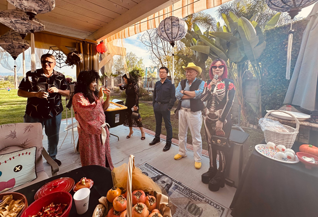 這場派對由她的兒子、兒媳與孫女通力合作完成——庭院裡南瓜燈閃爍,鬼魅與微笑並存;餐桌上佳餚美酒,香氣四溢。Elaine 的先生Stephen Thomas 是大律師,老神在在、坐鎮在這次萬聖節趴的主位。Elaine 的兒子 Henry 是中英文老師,主持活動遊刃有餘;兒媳是專業攝影師,捕捉了無數精彩瞬間;孫女則和朋友們一起參與遊戲與表演,讓整個下午生動活潑。