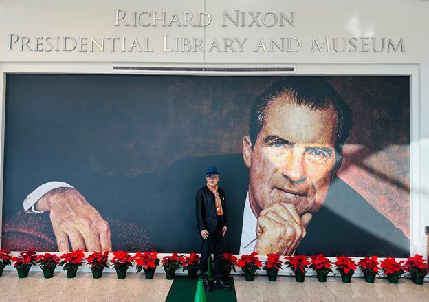 几天前,微信好友 Sherry Yang 发信息问我是否愿意一起参加“纪念世界反法西斯战争胜利 80 周年暨抗日战争胜利 80周年高峰论坛”。本来白天要上班、晚上剧组又有会议,但我还是决定前往。家里到尼克松图书馆不过一小时车程,却每次来到这里,我都会想起中美建交的历史,以及它如何深刻改变了我和无数人的人生轨迹。心中油然而生的敬意,使我每次都忍不住在尼克松总统的巨幅画像前留下身影。