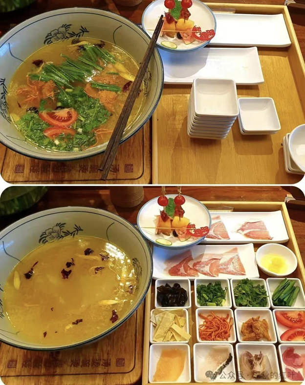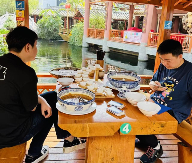 她的父亲来美国这三十年,每次回国探亲,第一件事都是去蒙自“过桥园”吃一套过桥米线。最后一次是 2024 年,那时一套已经卖到 280 元。过桥园用的是猪骨汤,环境却极为讲究——花园、流水、小桥、亭子,食客坐在水边桌椅上,慢悠悠地搅拌着加了菊花、鹌鹑蛋、宣威火腿和豆泥的高汤,用筷子挑起米线放进口中,再端起大碗喝汤,说着本地话,享受那种只有在故乡才能拥有的安心与自在。