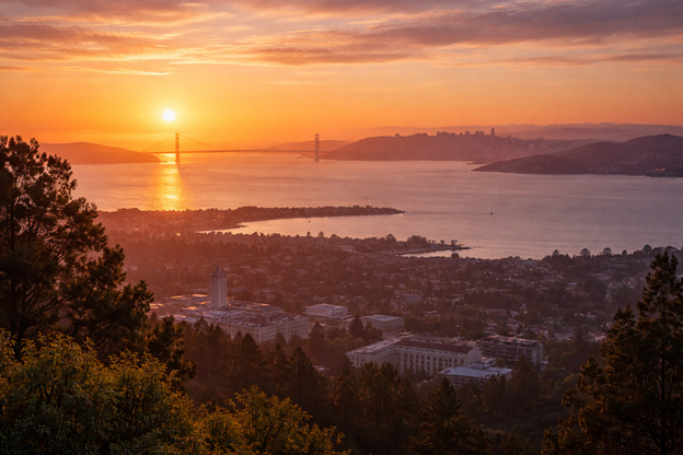 我们把车停在伯克利山顶的停车场,步行到观看日落的最佳地点。脚下是伯克利加大的校园,Sather Tower 矗立在中央;远处是连接奥克兰与旧金山的海湾大桥,再往外,是旧金山、红色的金门桥,连天使岛也隐约可见。
