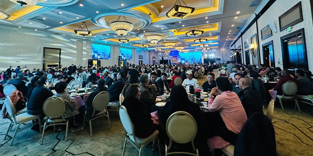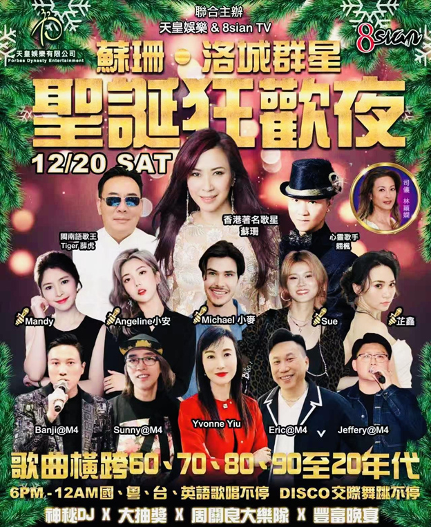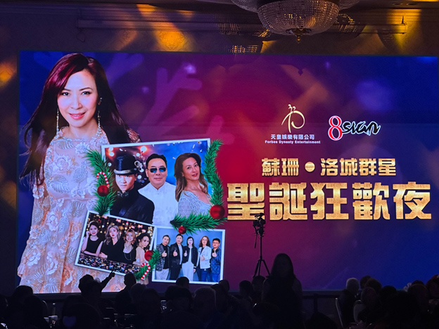 2025年12月20日,洛杉磯的冬夜燈火如織。由天皇娛樂有限公司與8sian TV 聯合主辦的「蘇珊與洛城群星聖誕狂歡夜」,在聖蓋博希爾頓酒店隆重登場。來自洛城各界的僑界人士、音樂愛好者與歌迷五百餘人齊聚一堂,在歌聲、掌聲與節日的溫度中,共度一個熱力四射、情感澎湃的聖誕之夜。
