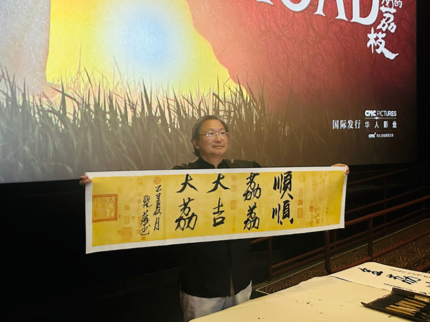 首映礼在热烈掌声中拉开帷幕。华人影业主持人Eileen女士首先邀请中国驻洛杉矶总领馆代总领事黄洪江先生发表致辞,表达了对电影文化交流的支持与祝福。北美书画院院长、国家一级书法师孙晓华(号太湖居士)特邀为电影题写贺词“顺顺荔荔 大吉大荔”,寓意票房节节高升、一路顺风。