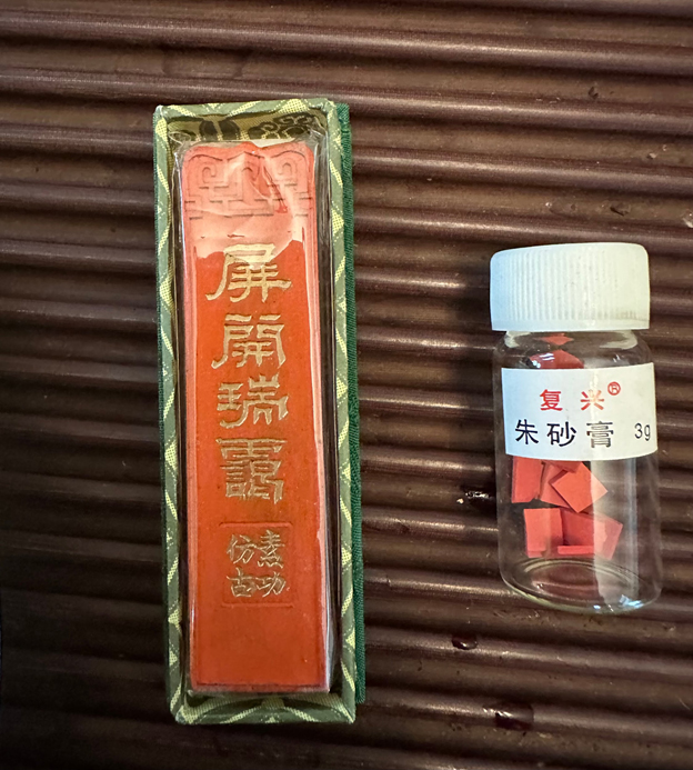 他拿出矿物原料制成的墨,又给我看朱砂、紫砂。他说,李可染他们用的是特制的墨,墨上写着“万紫千红”,为李可染题,中国画研究院监制,上海墨厂油烟一〇一出品。用的是自然矿物,而非如今的化学红。