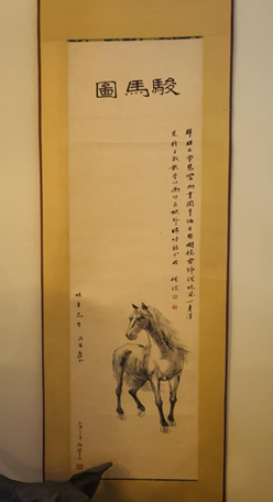 书房里还挂着一幅马。那并非徐悲鸿的马,而是与徐悲鸿同时代的沈逸千之作。画上有他外公的题字。这幅画,恐怕也是孤品。