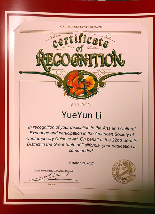 2017年李跃云书法作品在洛杉矶展出时,获国会议员赵美心等签字颁发证书