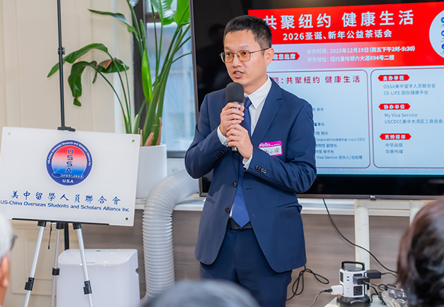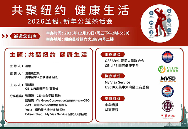 美东时间2025年12月19日下午,在纽约曼哈顿中城,来自大纽约地区的新老留学生与多领域杰出人士齐聚一堂,一场以“共聚纽约 健康生活”为主题,欢送2025年、迎接2026年的圣诞、新年公益茶话会在充满活力的氛围中成功举行。