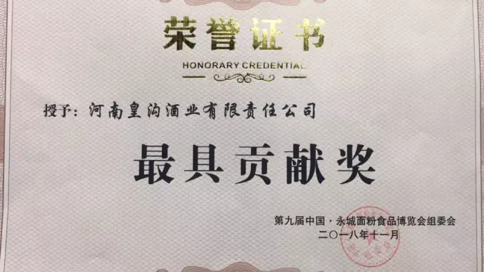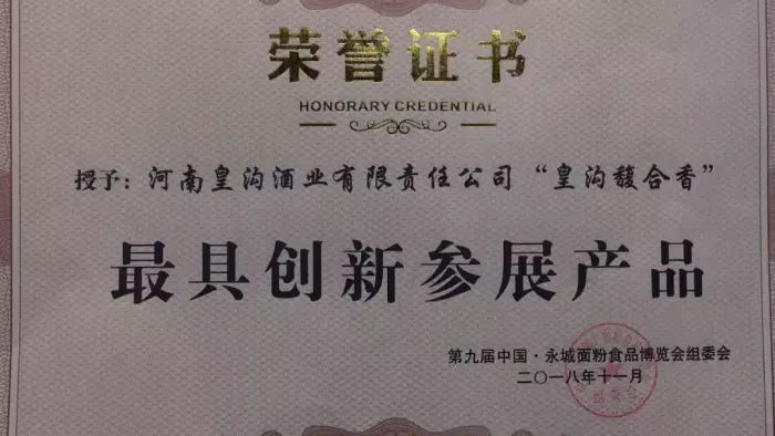 皇沟酒业在第九届中国(永城)面粉食品博览会评选表彰中荣获最具贡献奖与最具创新参展产品“皇沟馥合香”双殊荣。