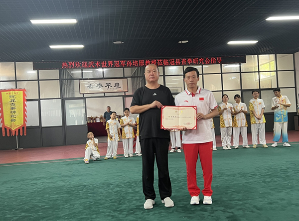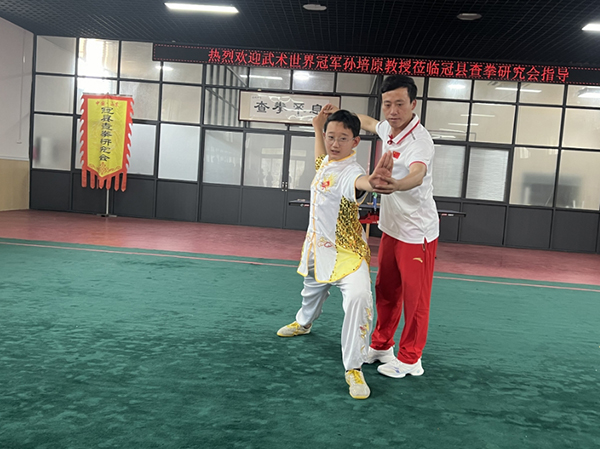 作为国际级运动健将,孙培原曾在世界武术锦标赛、亚运会与全运会等国内外重大赛事上荣获武术冠军。7日上午,世界武术冠军、山东体育学院教授孙培原出访国外刚回来,马不停蹄,深入冠县清泉中学与东街小学进行考察与辅导。在冠县教体局党组书记、局长王怀礼,中国武术九段、世界大健康联盟副主席李成银教授陪同下,武术冠军孙培原在训练场上矫健身影,引发了阵阵欢呼声。孙培原教授观摩学生习练查拳,悉心指导,亲身示范,并与学生互动交流,手把手教学,一招一式尽显冠军风范。随后,世界武术冠军孙培原走进冠县暨查拳学术研讨会在冠县会议中心举行,会议由冠县文旅局局长靳大虎主持,教体局局长王怀礼致欢迎辞,并系统介绍了近几年冠县对查拳保护与传承工作情况和未来“非遗武术查拳进校园”的规划与设想。在研讨会上,孙培原教授激情发言,高度赞扬并充分肯定了近些年来冠县对查拳保护和传承工作做出的不懈努力,并对国家级非遗查拳代表性传承人沙宗朝老师数十年如一日、传承发展查拳的卓著贡献给予高度评价和赞扬。同时,李成银教授也从学术角度充分肯定了沙宗朝老师对推动地方武术文化发展做出的重大贡献。来自上海、河南、山东等地的30余位武术界专家代表汇聚一堂,共同为查拳发展与创新开拓献计献策。8日,孙培原教授与查拳名家交流会上,首先由查拳传承基地的师生表演了查拳与器械,显示查拳发源地冠县代代相传;然后,由来自的上海查拳名家赵玉柏表演一路查拳独具魅力,上海精武会李新建与李传乡表演了查拳六路短打对练,对抗性强,反应灵敏,具有独特风格和实战技巧,紧接着,聊城冠县众多的查拳名家轮番上场,各展风采,显示了查拳发源地的优势与深厚实力!