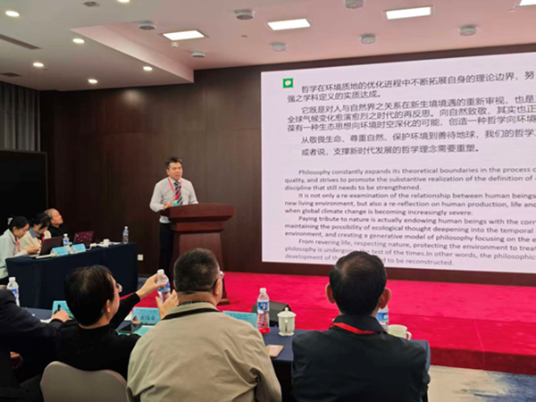 “北京大学的徐春教授就天人合一做了学术分享。北京航空航天大学的徐治立教授在《恩格斯和高兹生态自然观差异互补性及其现实意义》的发言中指出,“两者在生态自然观上的差异互补性,能够启发我们建立比较恰当的人化本体基础、认识方法原则和价值实践观念。要确切把握马克思恩格斯生态自然观的价值实践原则和高兹等生态自然观的现实实践举措的有机融合。”布达佩斯长期可持续发展中心主任阿提拉·格朗皮埃尔(Grandpierre Attila)博士指出,“‘生态’一词有‘生’——生命和‘态’——态度两重含义。生态文明可以看成是一种基于生命态度的文明,一种以生命为中心的文明。”东南大学刘魁教授做了《当代环境认知的三大危机与未来文明的发展趋向》的主旨报告,指出当代环境认知的三大危机,即主体唯一性危机,环境空间论危机,人类中心主义伦理危机。因此,生态文明作为一种价值观,环境治理与环境调试将成为新时代的使命。北师香港浸会大学怀特海研究中心的杨富斌教授在《生态文明视野下的环境哲学与有机哲学》的专题发言中指出,“环境哲学是一门以‘人与自然’为核心的应用哲学,打破了‘人类—自然’二元对立思维,以实现人类与自然的协调共生和可持续发展。”英国卡迪夫大学哲学系荣休教授RobinAttfield在线上就如何应对全球环境危机并促进可持续发展做了主旨发言。