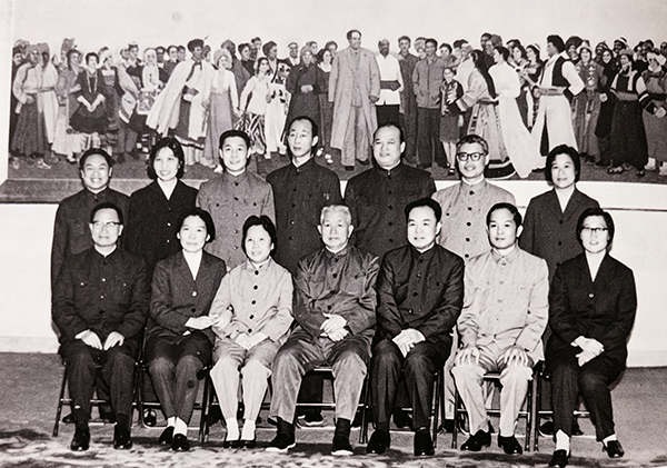 (第一排左起:黄建谟、李国珍、大使人朱深、大使黄镇、商务参赞彭金波、王天明、尚志先,后排左起:罗开富、金珠冠、袁娱酥、李文群、任志杰、乐新、杨彐珍。)