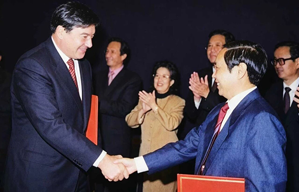 1994年9月为利用法国政府提供的混合贷款54万美元为四川省电力局引进2×12万千瓦水轮机组。由罗开富(前排右一)和法国 CEGELEC公司总裁(前排左一)在合同上签字。时任外经贸部部长吴仪同志(正中)和国家计委副主任曾培炎同志(后排右起二)以及中国驻法国大使蔡方柏同志(后排右一)及法国工业和贸易部部长隆芸(后排左起一),出席了签字仪式。