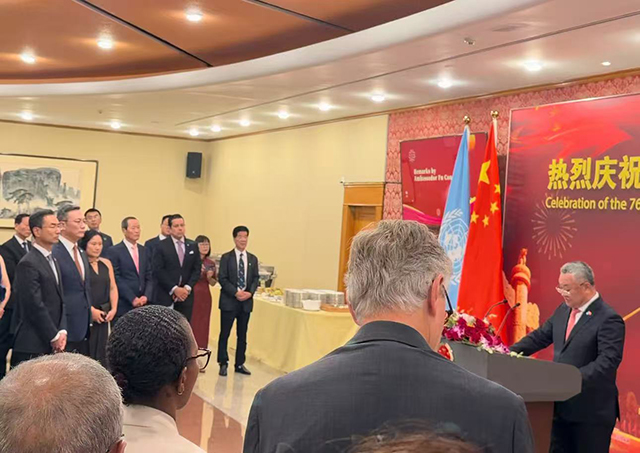 当地时间2025年9月29日晚,中国常驻联合国代表团在纽约举行招待会,庆祝中华人民共和国成立76周年。联合国官员、各国使节及各界友人欢聚一堂。