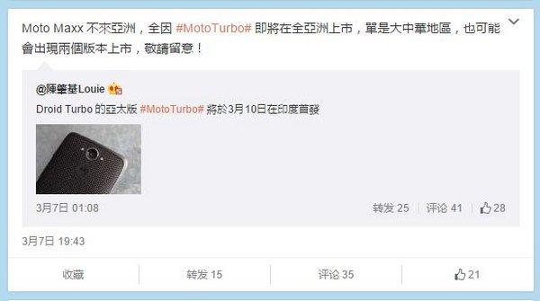 如果你希望拥有一款续航表现出众的旗舰机型,那么摩托罗拉在去年推出的Droid Turbo无疑是个值得考虑的对象。日前,根据摩托罗拉官方公布的消息显示,该机将会在三月十日登陆印度市场。同时来自摩托罗拉代理商的爆料称,这款拥有凯夫拉材质和金属玻璃纤维机身的旗舰新机将在亚洲市场全面上市,单是大中华地区便有可能会有两个版本问世。 将全亚洲发售  作为摩托罗拉去年推出的旗舰机型,Moto Droid Turbo是否会在全球市场问世一直为人关注。尽管摩托罗拉在巴西市场发布了该机的变种版本Moto Maxx,但已经确认不会在欧洲发售,这多少有些令人失望。不过,摩托罗拉却计划在亚洲市场全面发售该机,并且根据官方公布的信息显示,这款旗舰机型将更名为Moto Turbo,并于三月十日在印度首发,由印度最大的网上商城Flipkart上架销售,但价格暂时未知。 值得一提的是,Moto Turbo还将面向全亚洲市场推出。根据摩托罗拉及联想在香港的代理商披露的消息称,Moto Turbo即将在全亚洲上市,并且单是大中华地区便可能有两种版本推出。不过,目前暂时还不清楚大中华版本的具体发售时间和相关价格。 两大版本登场 值得一提的是,此前联想在完成对摩托罗拉收购的时候,联想高层曾经在接受媒体采访时表示,将会有包括Moto X以及Droid等机型在国内问世,所以预计Moto Turbo在将有行货版本推出应该是没有多少悬念的事情。 因此,如果Moto Turbo确实有两个版本在大中华地区推出的话,那么不仅意味着摩托罗拉会将原版Droid Turbo和变种版本Moto Maxx都悉数引进到了大中华地区,而且也预示着未来的行货版本应该也有电信版本和联通版本推出。 或将四月发布  至于Moto Turbo行货两大版本的差异方面,预计联通版或公开版应该便是Moto MAXX。该机的核心配置与电信版本并没有太多差异,主要变化是会去掉一些定制服务,并且将取消了CDMA/EVDO Rev.A网络功能,而是支持GSM/WCDMA/HSPA/LTE网络。当然,无论是哪个版本都会装载5.2英寸2K分辨率显示屏,拥有高达565ppi 的像素密度,并将支持防泼溅功能。内置有2.7GHz骁龙805处理器,拥有3GB内存和64GB存储容量,并配备2100万像素主摄像头,支持LED闪光灯和4K视频录制。 Moto Turbo还有一大特色是配备了3900毫安时超大容量电池,可提供长达48小时的续航时间。支持快速充电功能,能够在十五分钟内为手机储存足够使用八个小时的电量。此外,由于Nexus 6的行货版本将于三月份国内问世,所以预计Moto Turbo应该会在四月份正式登场。