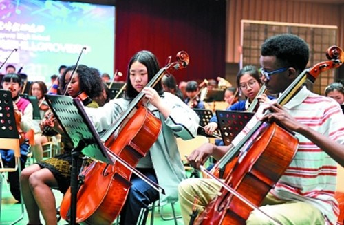 日前,来自美国的希尔格罗夫青年交响乐团和青年交响管乐团近300位成员与杭州市中小学生艺术团的近200名学生在杭州演奏《蓝调终曲》《茉莉花》《威风凛凛进行曲》等交响乐名曲,用音乐的方式缔结友情。