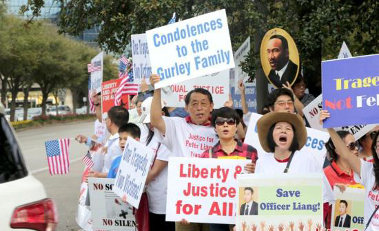 美国第四大城市休斯敦超过2000人在该市最繁华的GALLERIA商业区高举标语牌游行示威,声援梁彼得警官。中新社记者 王欢 摄