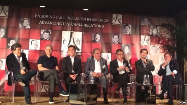 好莱坞电影制作人在“百人会”年会上讨论好莱坞与中国。从左至右: 唐伟,(唐媒体合伙公司发起人)、阿里.伊曼纽尔 (WME-IMG联合首席执行长),高群耀(北京万达文化产业集团有限公司, 首席执行官)、詹姆斯.吉纳普利斯 (20 世纪福克斯董事长和首席执行官)\黎瑞刚( 华人文化产业投资基金董事长)和罗伯特.西蒙斯(STX娱乐公司董事长和首席执行官) (美国之音斯洋拍摄)
