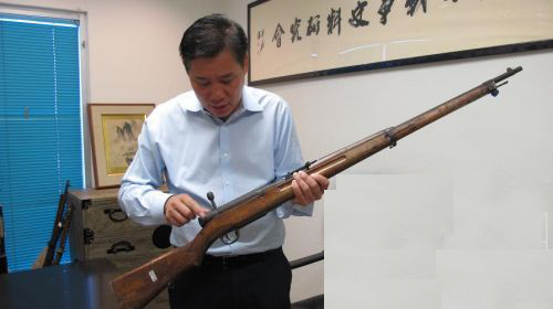 刘磊介绍日军中国战场专用的三八式步枪“三八大盖”。