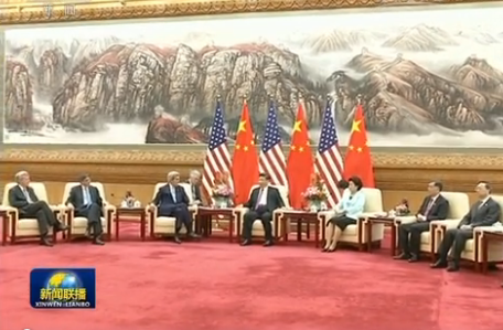 国家主席习近平7日在人民大会堂会见来华出席第八轮中美战略与经济对话和第七轮中美人文交流高层磋商的美国国务卿克里、财政部长雅各布·卢。