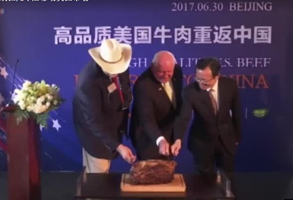 6月30日,在这场庆祝仪式上,美国农业部部长桑尼∙普度与美国全国养牛业者牛肉协会总裁克雷格•乌登、中国中粮集团副总裁栾日成共同切下一片来自内布拉斯加州的上等牛排肉,正式标志着美国牛肉产品经过14年的空档期,重返中国市场。