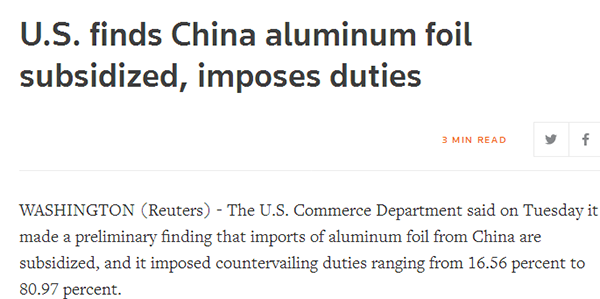 美国商务部8月8日宣布初裁结果,认定从中国进口的铝箔产品存在补贴行为,补贴幅度为16.56%至80.97%。