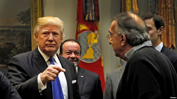 美国总统川普主持美国汽车业执行执行官会议时和菲亚特克莱斯勒首席执行官马尔乔内交谈。(2017年1月24日)