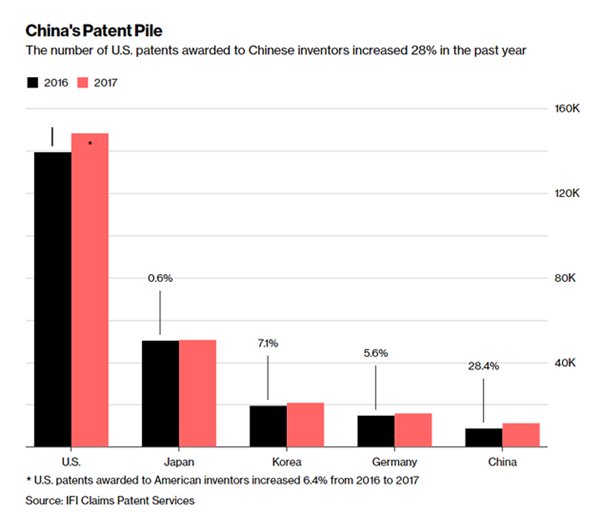 IFI Claims Patent Services周二发布了一份报告,报告中的数据显示,2017年中国发明者共计获得了11241项美国专利,相比2016年同期上涨了28%。