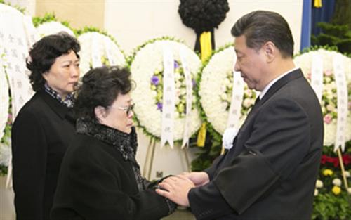 1月22日,张万年同志遗体在北京八宝山革命公墓火化。习近平、张德江、俞正声、刘云山、王岐山、张高丽等前往八宝山送别。这是习近平与张万年亲属握手,表示深切慰问。新华社记者马占成摄