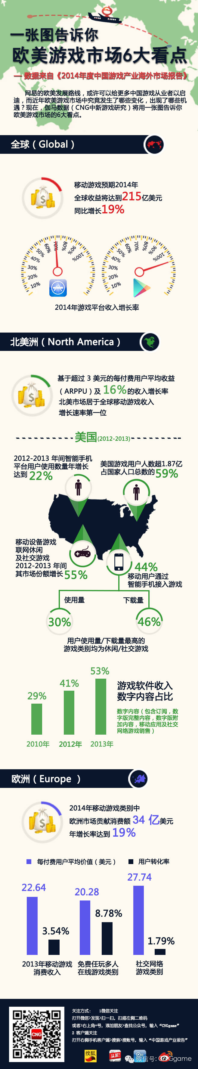 网易的欧美发展路线,或许可以给更多中国游戏从业者以启迪,近年欧美游戏市场中究竟发生了哪些变化,出现了哪些机遇?现在,伽马数据(CNG中新游戏研究)告诉你欧美游戏市场的6大看点 | 近日,网易(NASDAQ:NTES)宣布成立美国总部,由游戏行业资深人士David Ting担任网易北美总经理,致力于为西方用户研发包括移动游戏在内的互联网娱乐产品,并计划于2015年在欧美市场发布《Speedy Ninja》(暂定名称)等多款游戏。 作为一家在美国上市的中国公司,自2000年网易在美国纳斯达克股市上市起,网易已经将美国暴雪的7款产品引入中国大陆地区并独家运营,将《新大话西游2》(口袋版)、《梦幻西游2》(口袋版)等移动游戏推向全球20多个欧美国家。而今网易基于150亿美元的市值、3600多名员工的开发和拓展能力、50余款自主研发和代理运营的游戏作品,从头开始集中致力于为欧美用户开发内容,或许说明欧美用户对中国游戏发展的重要性。