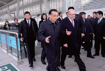 作为国民眼中的“高铁代言人”,李克强走到哪里,“超级推销”的旋风就刮到哪里。2013年11月,李克强访问罗马尼亚时就曾与中东欧16国领导人或代表共同参观了“中国铁路等基础设施及装备制造展”,并在一块展板前生动“解说”,为中国装备做补充说明。